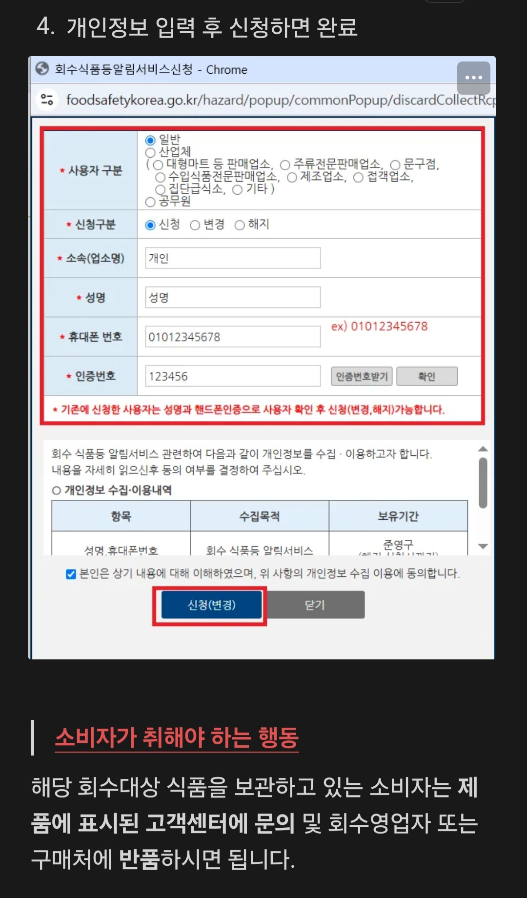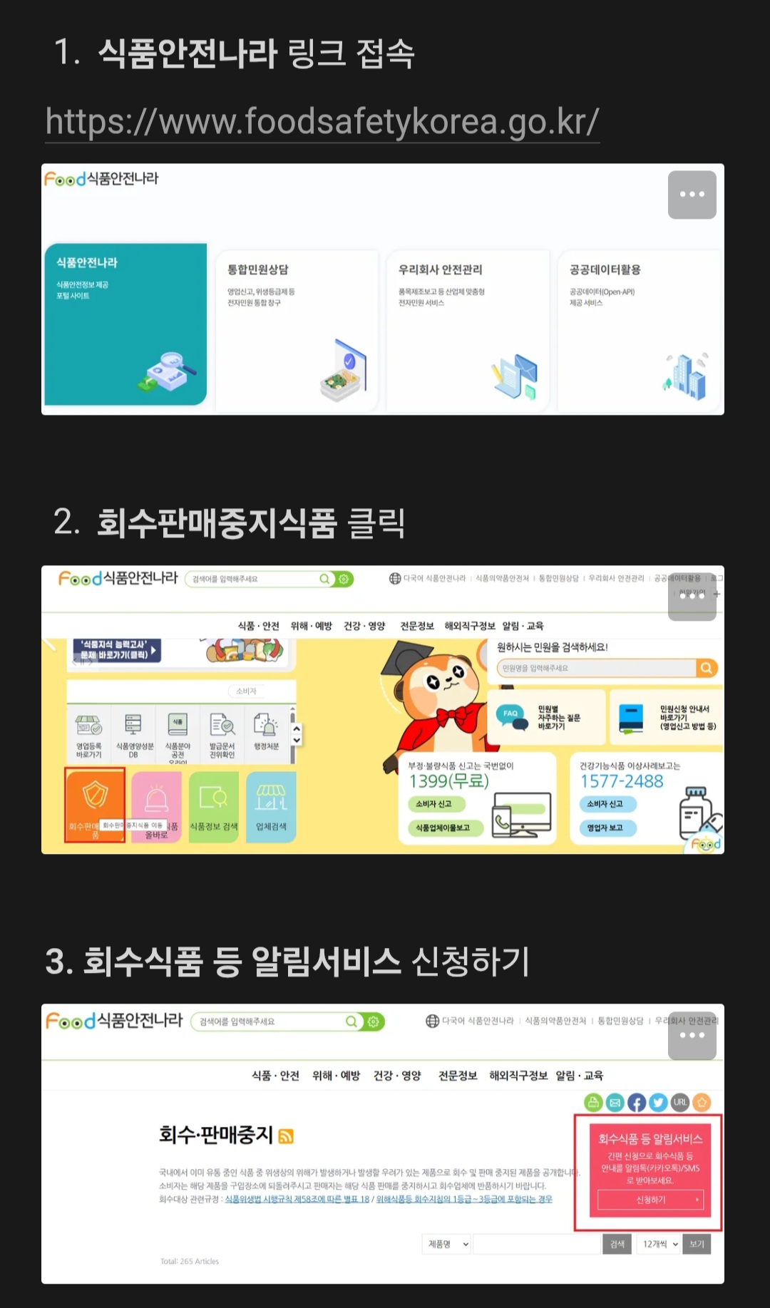 회수판매 중지 식품 알림 서비스 신청 방법과 해당제품 반품 방법